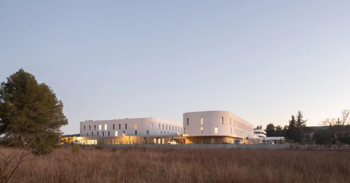 L’ancienne clinique Provence-Azur située dans le village d’Éguilles, aux portes d’Aix-en-Provence, était devenue vétuste. Le site de remplacement retenu, en lisière de la plaine voisine, s’inscrit dans un territoire en transition, entre terres agricoles, zones pavillonnaires et équipements urbains. La maîtrise d’ouvrage attendait un outil fonctionnel adapté aux exigences d’un équipement médical pluridisciplinaire. Parmi les priorités figuraient l’optimisation des distances, la distinction des flux patients/visiteurs et la continuité du parcours de soins. Un marché privé suivi d’une commande directe a dès lors été lancé.