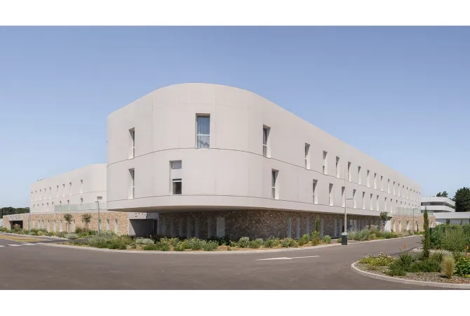 La dimension esthétique et symbolique n’est pas en reste : dominant, le blanc du béton évoque la pureté, la clarté et la sérénité propres à un établissement de soins. L’architecte évoque à cet égard les « moments de vie parfois fragiles – naissance, rééducation ou fin de vie ». Caractérisé par ses angles arrondis, le vocabulaire architectural organique souligne la dimension protectrice et bienveillante que contient l’idée de prendre soin.