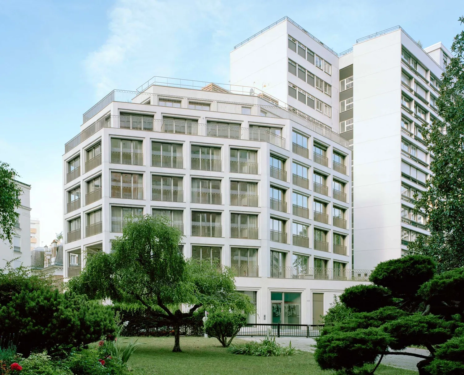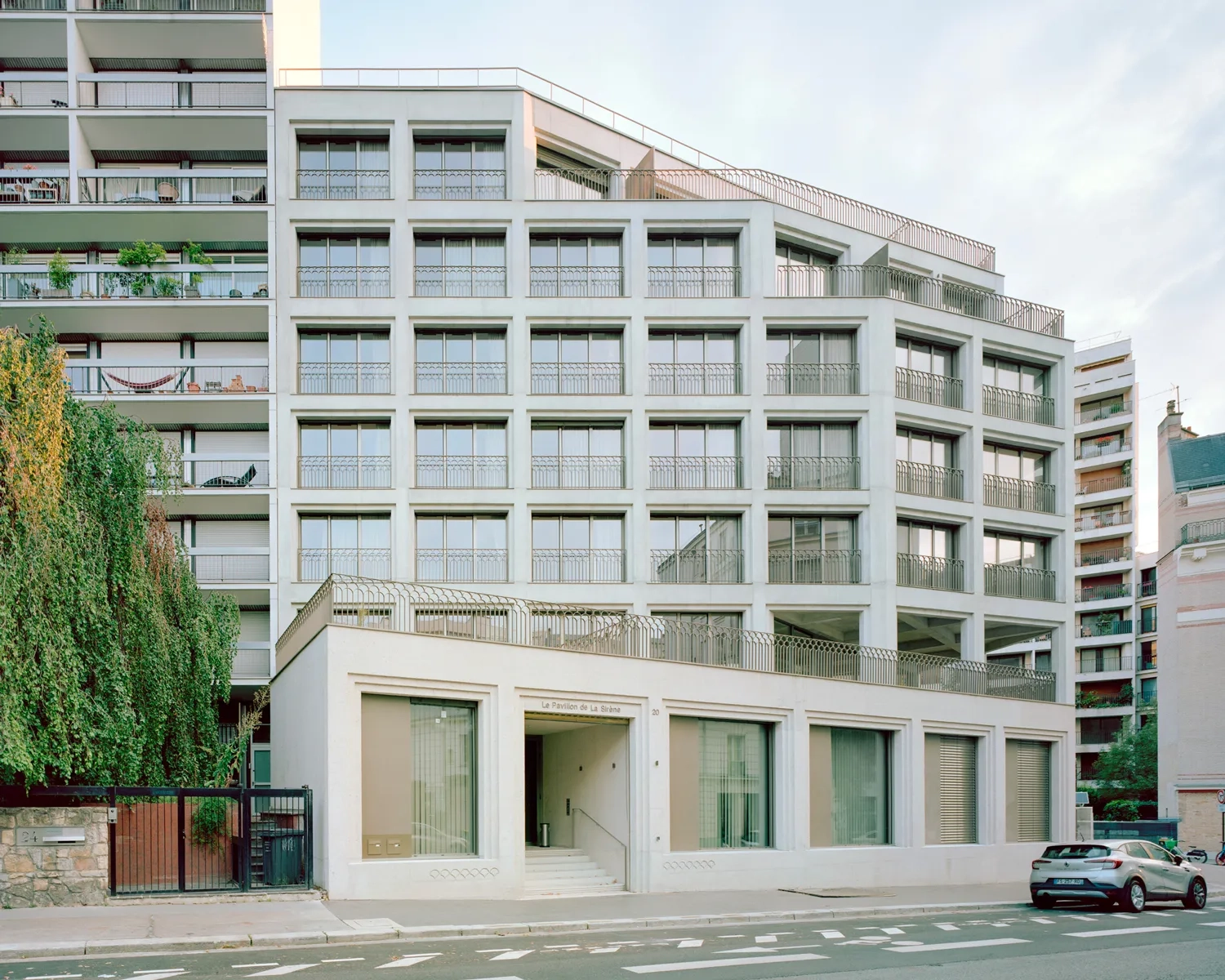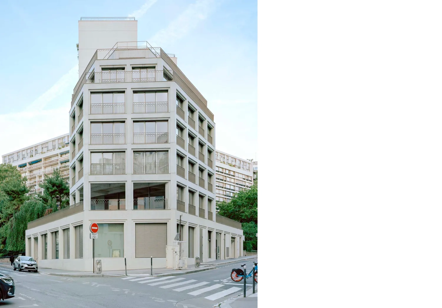 Édifié entre 1965 et 1968 par Arthur Héaume et Alexandre Persitz, tous deux formés auprès d’Auguste Perret, l’immeuble de quatorze niveaux affirme une présence massive au carrefour. Il faut dès lors composer avec cet imposant voisin, ainsi qu’avec un environnement urbain où les styles, les hauteurs et les implantations contrastés révèlent un parcellaire parisien particulièrement contrarié.