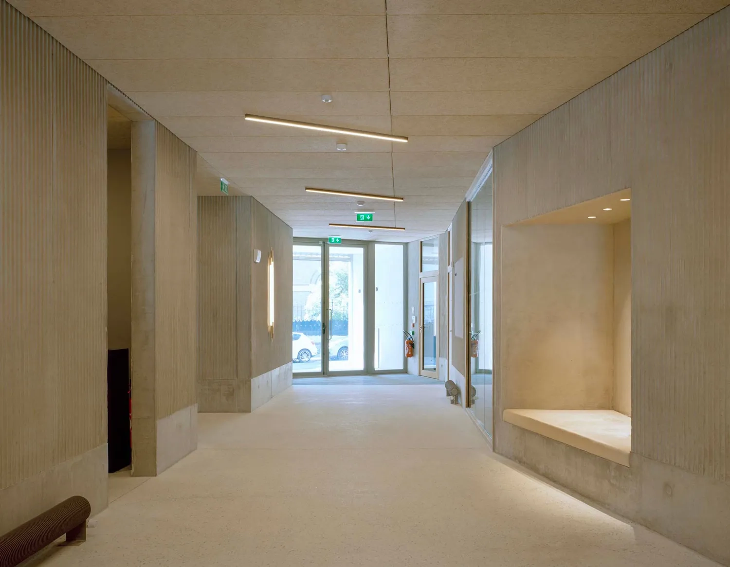 Ainsi, les murs en béton architectonique matricé habillent le hall et les accès à l’auditorium. La cage d’escalier, les poteaux et les poutres des étages de logements assument, pour leur part, un béton brut de décoffrage. Les sols intérieurs sont réalisés en béton poncé, prolongeant cette continuité matérielle, et les façades en béton bouchardé en révèlent la richesse chromatique. À l’entrée, une matrice intégrée aux banches génère un motif d’écailles, discret rappel de l’identité de La Sirène.