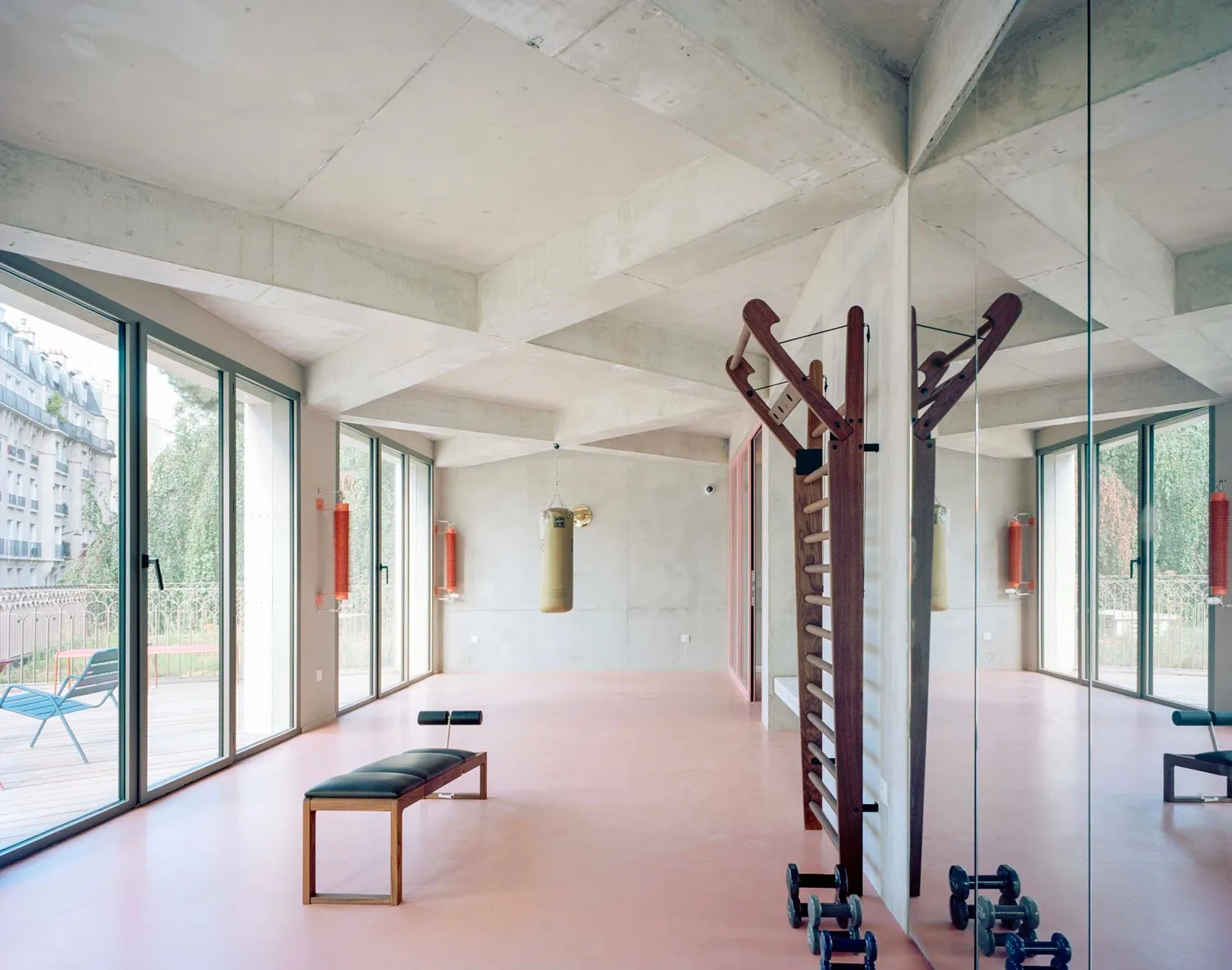 Dans les étages supérieurs, une attention particulière est portée à l’architecture du logement, conçue comme le prolongement direct de la structure de l’équipement musical. Le premier niveau accueille principalement des espaces collectifs tels qu’une cuisine avec séjour, une salle de sport, une laverie et une grande terrasse, laquelle est partiellement protégée par un creux ménagé dans le volume bâti. Ce retrait, générant un porte-à-faux, a nécessité la mise en œuvre de refends travaillant comme des poutres-voiles, participant à la stabilité de l’ensemble. La qualité d’habitabilité repose sur un soin constant apporté aux détails : larges baies vitrées amplifiant les surfaces des studios, salles de bains éclairées en second jour par des impostes, cuisines et mobilier dessinés sur mesure. Modulables, les éléments de mobilier peuvent se déplacer, se réagencer et s’encastrer afin de libérer l’espace selon les usages. Disposant d’un accès indépendant de celui de La Sirène, les 51 logements sont desservis par un volume d’escalier éclairé naturellement par de larges baies sur rue et dont le garde-corps, finement mis en œuvre, est directement scellé dans le béton.