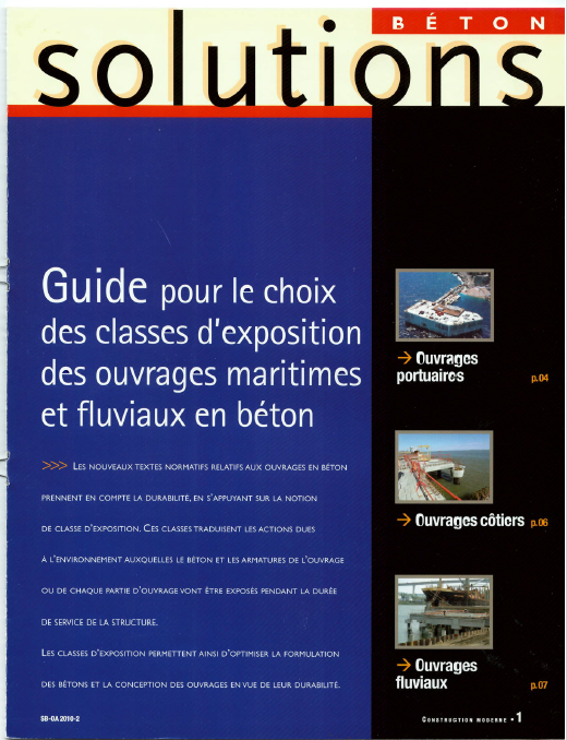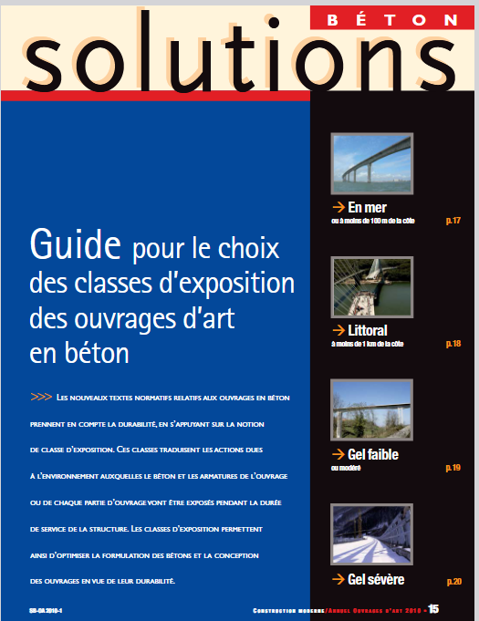 Pour le choix des classes d’exposition d’ouvrages de génie civil, il est conseillé de se référer aux guides (des ouvrages d’art en béton, des ouvrages maritimes et fluviaux en béton, des tunnels routiers creusés, d'ouvrages divers de Génie Civil) de la Fondation de l’École Française du Béton (EFB) :