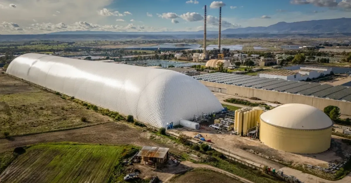 Une « batterie à CO2 ». Développée par la société milanaise Energy Dome, l'installation comprime et dilate quotidiennement du CO2 dans son système fermé, faisant tourner une turbine qui génère 200 mégawattheures d'électricité, soit 20 MW en 10 heures.