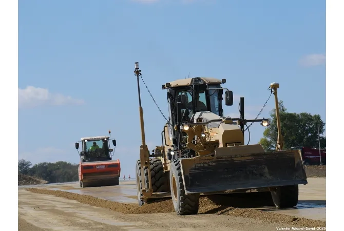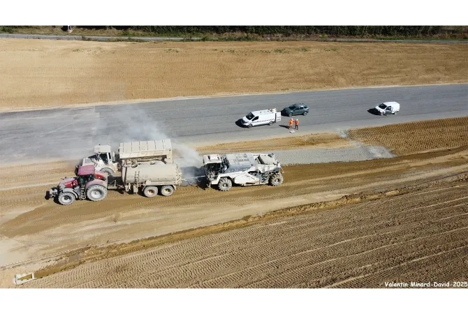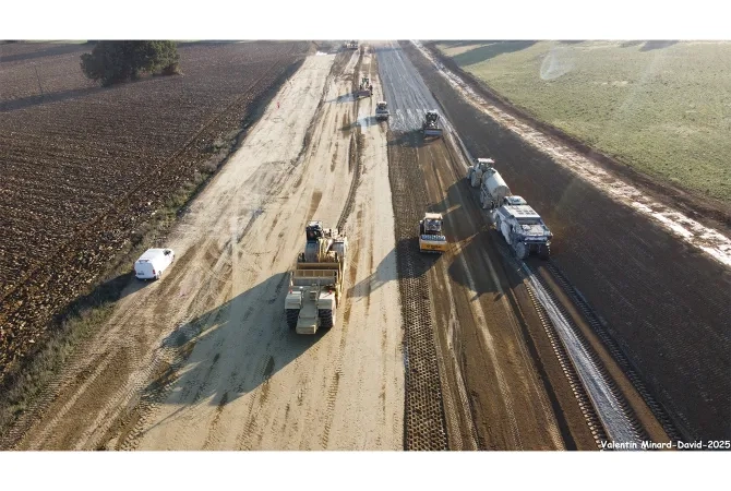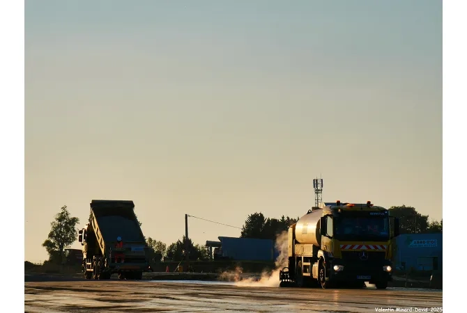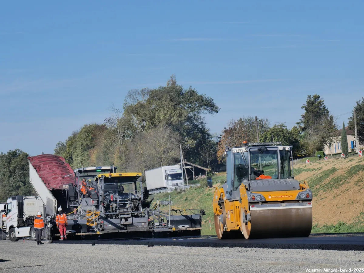 La mise en œuvre des matériaux bitumineux par l’agence Grands Travaux Enrobés (AGTE) de Roger Martin est en cours (début 2026). Les matériaux bitumineux (GB4, BBSG et BBTM), fabriqués à la centrale mobile et transportés sur le chantier dans des camions bâchés, sont mis en place successivement à l’aide d’un finisseur HPC, équipé d’une table de 11 m de largeur.