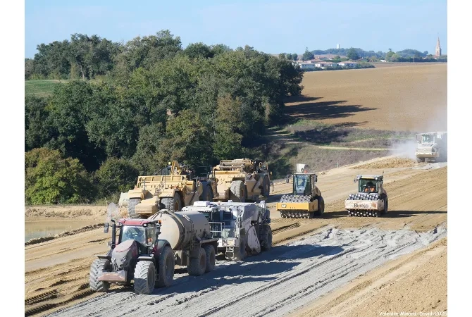 La mise à 2 x 2 voies de la RN124, entre Gimont et L’Isle-Jourdain, est le dernier tronçon du vaste chantier d’aménagement de la RN124 entre Auch et Toulouse et l’un des plus grands chantiers de terrassement de France en 2025. Il fait appel à la technique de traitement des sols en place pour la réalisation des remblais, le renforcement de l’arase et la confection de la couche de forme. Les travaux ont été confiés au groupement Roger Martin, Buesa TP, GTM, Aximum, sous la maîtrise d’œuvre de Setec International et la maîtrise d’ouvrage du conseil départemental du Gers. Ils ont répondu aux exigences de la maîtrise d’ouvrage en matière de gestion des déblais excédentaires (300 000 m3) et permis d’atteindre l’objectif de plateforme support PF3. À cette fin, l’entreprise a réalisé un traitement de la couche de forme au liant Ligex M4, fourni par Heidelberg Materials.