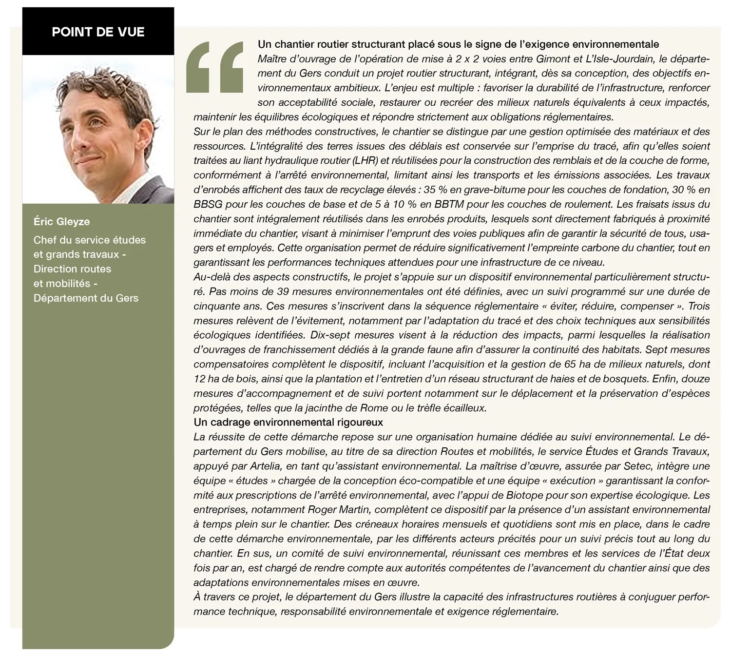 « Il a permis de réutiliser et de valoriser les matériaux du site, mais aussi de limiter le recours aux matériaux extérieurs au chantier, abaissant ainsi les coûts et les impacts du transport. En outre, ce chantier a été un défi du point de vue de l’organisation – en particulier, au regard de la longueur du tracé et des nombreux ouvrages qui le jalonnent –, du respect des enjeux environnementaux durant les travaux et de la mise en place de mesures compensatoires », ajoute Éric Gleyze.