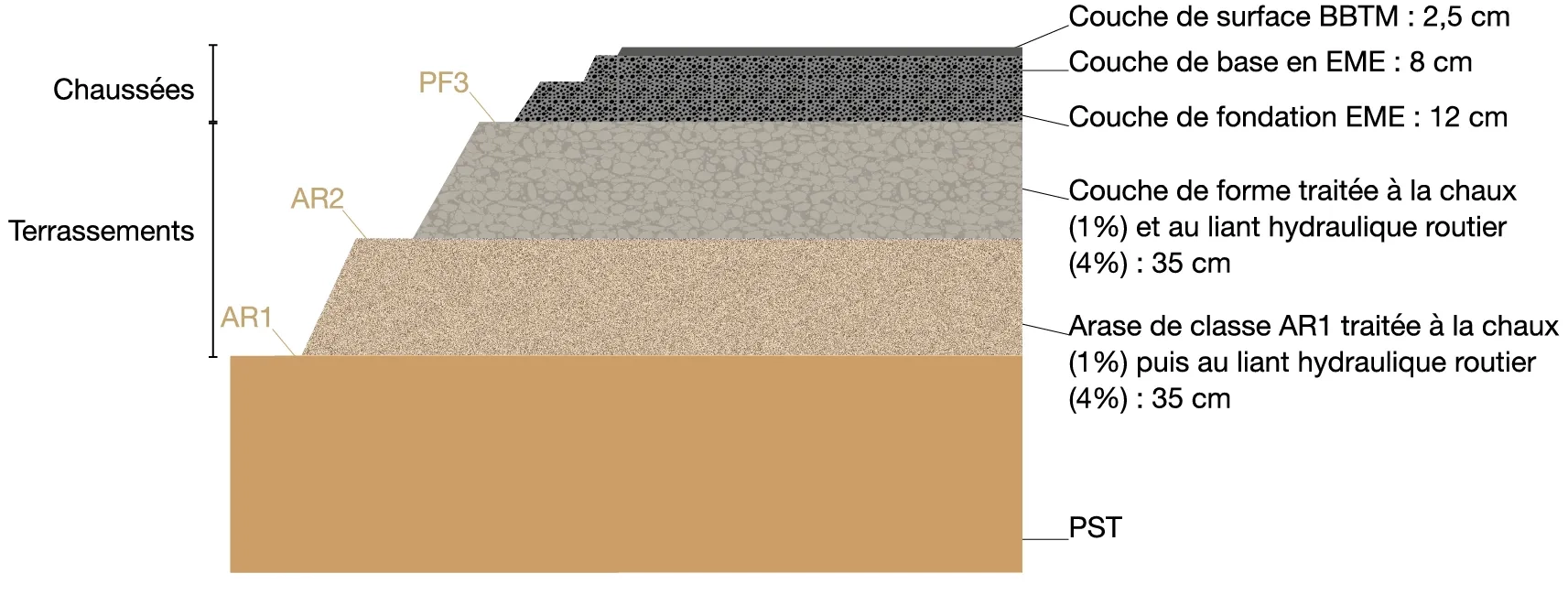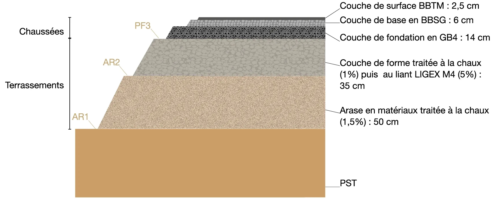 Pour une plateforme support de portance PF3, le calcul mené avec le logiciel Alizé a permis d’établir le dimensionnement de la chaussée. La structure de chaussée de l’appel d’offres a donc été la suivante :
