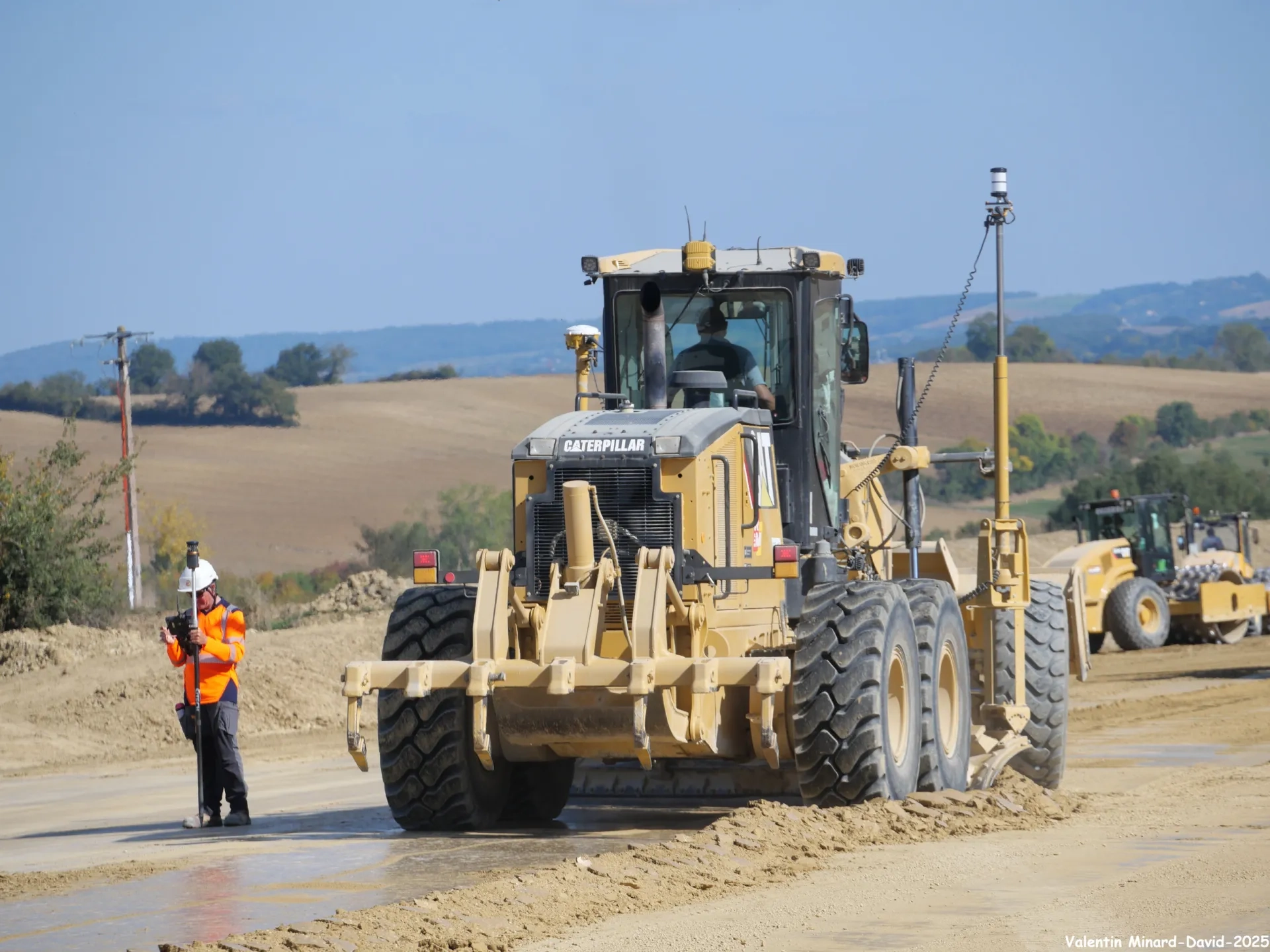 Une nivelleuse avec guidage à la station robotisée effectue le réglage final. Le contrôle géométrique est effectué par levée topographique. ©Valentin Minard-David/Roger Martin