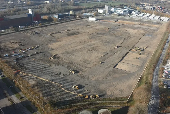 - Travaux de dépollution du site (au premier semestre 2025) : excavation des sols pollués par les sulfates (45 000 t), transport par Mymat (principalement par voie fluviale) jusqu’à la plateforme de recyclage et de valorisation des terres polluées de Medinger & Fils, également installée sur le port de Bruyères-sur-Oise ;