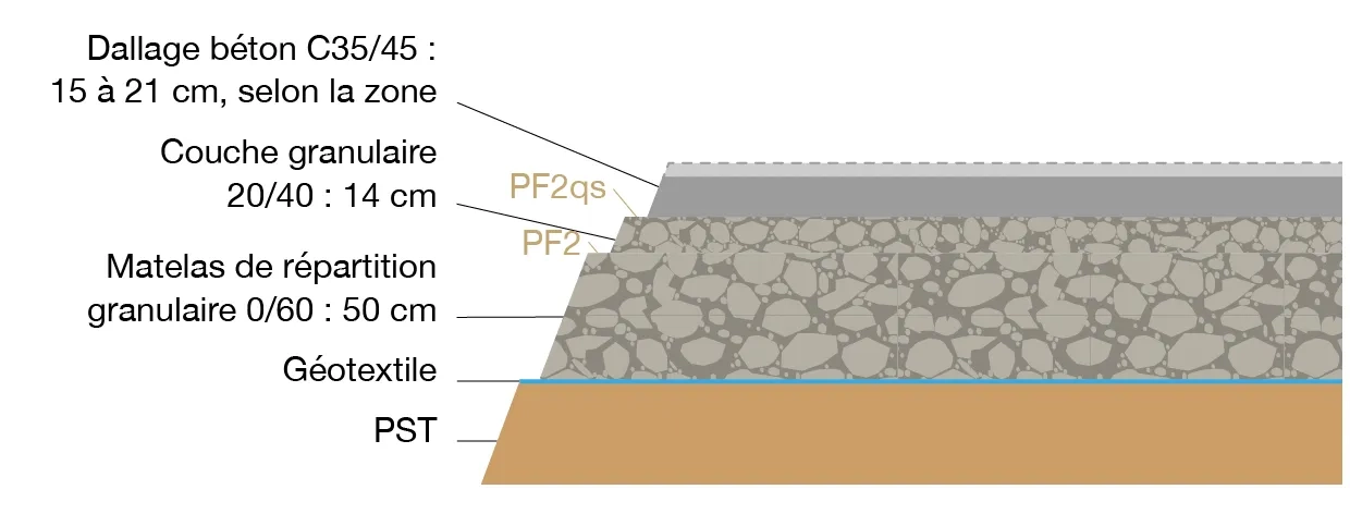Sous le bâtiment logistique, la plateforme support est dimensionnée pour supporter une charge au sol variant selon la zone (de 0,5 à 3 t/m²). Le dispositif préconisé pour les fondations se compose donc d’inclusions rigides en béton non armé, ancrées dans la formation crayeuse, et d’un matelas de répartition granulaire 0/60 mm, d’épaisseur 50 cm, posé sur un géotextile. L’objectif visé est une plateforme support PF2, de portance minimale 50 MPa.