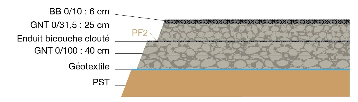 - D’une couche de base en grave-bitume de classe GB2, 0/14 mm, d’épaisseur 12 cm ;