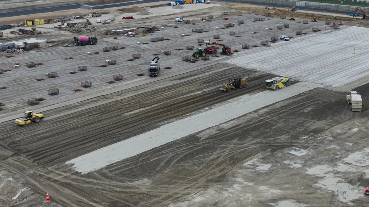 Dès l’obtention des performances minimales requises, confirmée par des essais de portance à la dynaplaque, le dallage à l’intérieur des bâtiments a été réalisé par Mendes en faisant appel à un béton « bas carbone », de classe C35/45, conformément à la norme NF EN 206+A2/CN, d'épaisseur variant entre 15 et 21 cm, selon la zone du bâtiment.